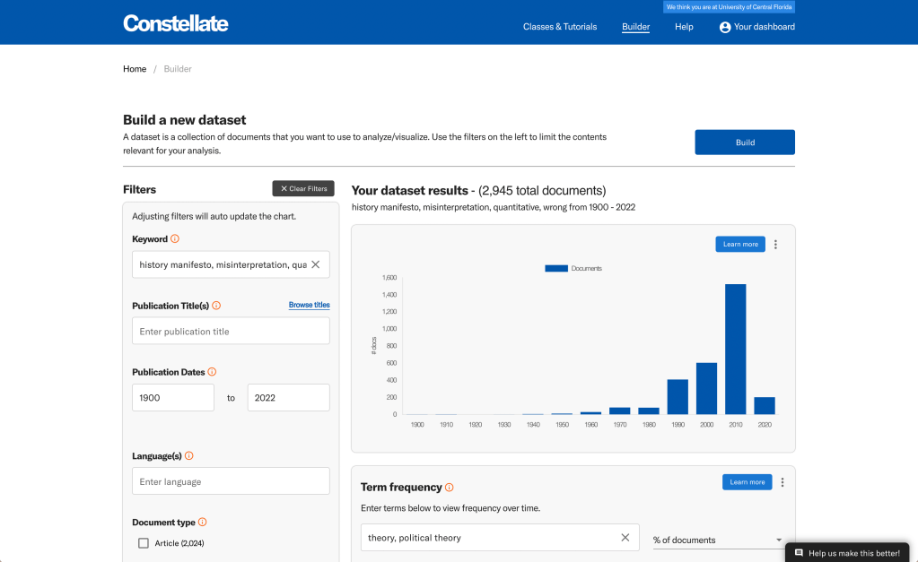 Using these selected works as a sample group, I plan on breaking down the common themes and phrases throughout these sources using textual analysis. I will also see if there are common themes within the JSTOR Data for Research tool Constellate to see if I can successfully text mine JSTOR for the frequency of these concerns mentioned in different journals. By cross-referencing these phrases I hope to examine how frequently specific “problems” within the digital historiography emerge.