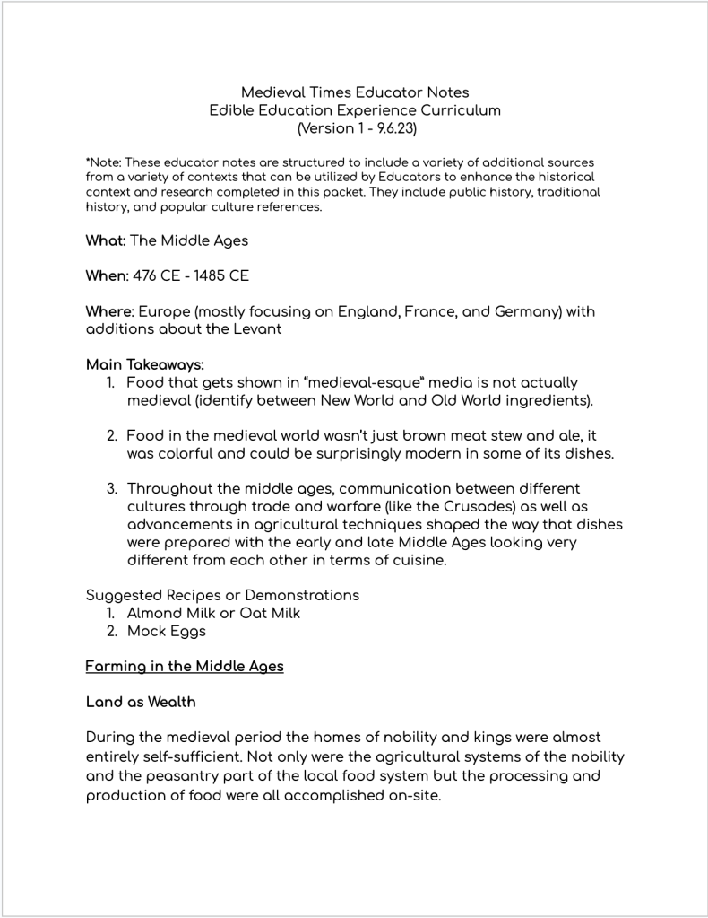 One of the biggest challenges that I had over the course of my writing was finding a way to blend the information that I had in my head from previous research and experience with the introductory information that would be required for another educator to teach the information I was sharing. I had to keep reminding myself that the person reading what I was writing didn’t hadn’t read the same books that I did and may not know that tracts of farmland were known as “hides.” I ended up with about 8 pages of educator notes featuring historical context and links to public history sites, book reviews, open-source texts, and videos on the cuisine of the Middle Ages. I also added an additional selected bibliography with the books that I referenced throughout my notes.