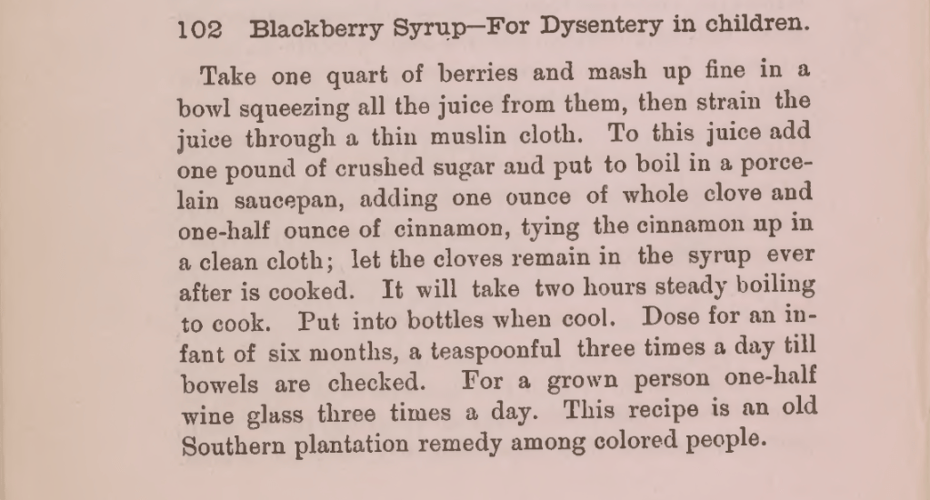 I am from Kansas and thus more familiar with the culture of Midwestern casseroles and Kansas City BBQ than I am with Southern fare, but I think that building a curriculum focused on a topic I’m unfamiliar with will be beneficial for my own experience in developing Education programs and figuring out what the most relevant and digestible parts of a single historical period really are for a specific audience, in this case educators teaching children. So after a meeting with Megan who pointed me to a few texts, I looked into the book What Mrs. Fisher Knows About Old Southern Cooking. This book was published after the 1879 Sacramento State Fair, the digitized version on the Library of Congress database is from 1881 and is believed to be the second cookbook written by an African American woman, the first being a book by Malinda Russell from 1866. The manuscript features recipes ranging from basics like meringue and pie crust to techniques for roasting meat, salads, to “Blackberry Syrup – for Dysentery in Children”. The inclusion of this last recipe is not entirely unheard of in 19th century cookbooks I’ve seen it before in other cookbooks as early as the 1820s and as late as the early 1900s. Given the personal nature of many cookbooks, domestic servants, enslaved women, and free women alike would utilize the herbs, plants, and foods around them as convalescent foods and home remedies. What is unique is that there is only one medicinal recipe in Mrs. Fisher’s book and it’s located in an odd section in the middle of the book labeled “Preserves, Spices, Etc.”.